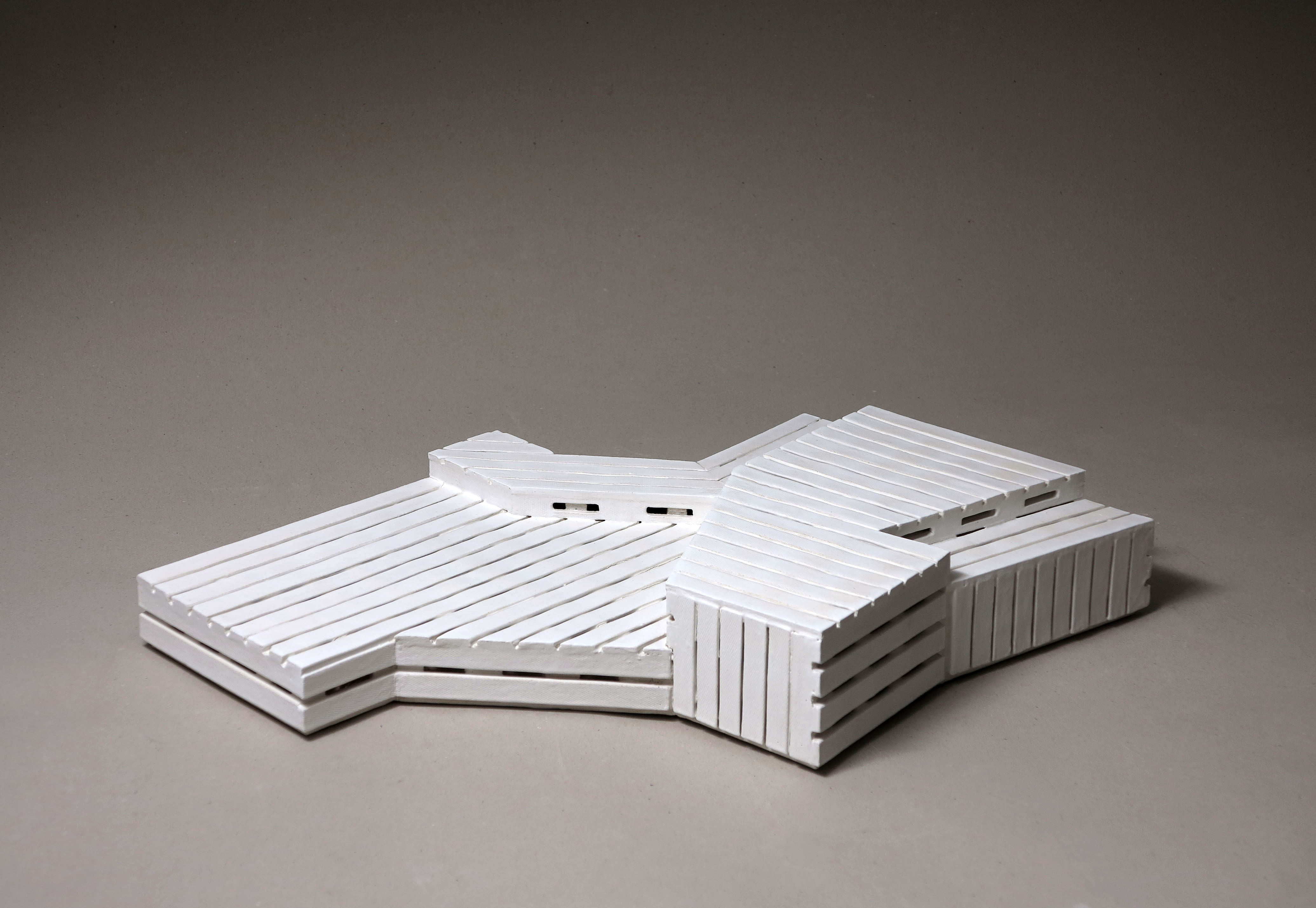 En este contexto disciplinar y creativo emerge el trabajo de la escultora con sus piezas, minimalistas, geométricas y blancas, de interesantes interferencias entre la tridimensionalidad escultórica y la habitabilidad de la arquitectura.