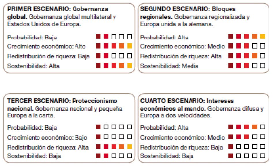 Europa será una de las áreas relevantes. Una Europa económicamente más cohesionada, donde la unión monetaria, bancaria y fiscal será una realidad, pero no la política, y donde Alemania será la potencia más influyente. Este escenario será favorable para España, que será capaz de paliar los efectos de la limitación del comercio mundial mejor que otros socios europeos, gracias a que Latinoamérica y la Unión Europea serán el principal destino de nuestras exportaciones.