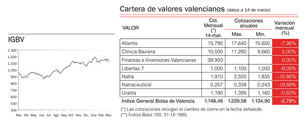 Por lo que respecta al volumen negociado a través de la Bolsa de Valencia, se contrataron cerca de 2.759 millones de euros durante el mes de febrero. En la primera quincena de marzo se han negociado más de 1.817 millones de euros.
