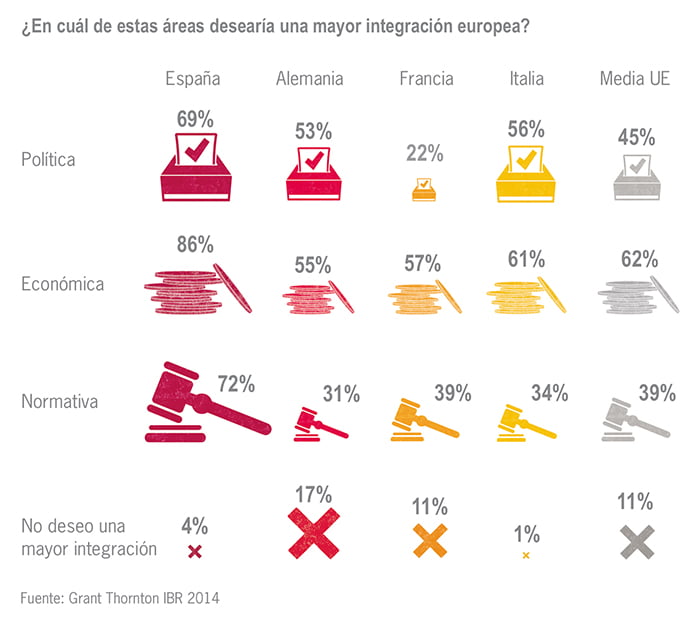 Un 86% de los encuestados en España aboga en 2014 por una mayor integración económica en la Unión Europea (8 puntos más que el año pasado). El apoyo a una mayor integración política alcanza el 69% (6 puntos más que en 2013), mientras que un 72% desearía una mayor convergencia normativa (5 puntos más que en el año anterior). Estos porcentajes resultan muy superiores a los del resto de la eurozona, donde la media de apoyo alcanza el 62% en el caso de la integración económica, el 45% en el de la política y tan solo el 39% en la convergencia normativa.