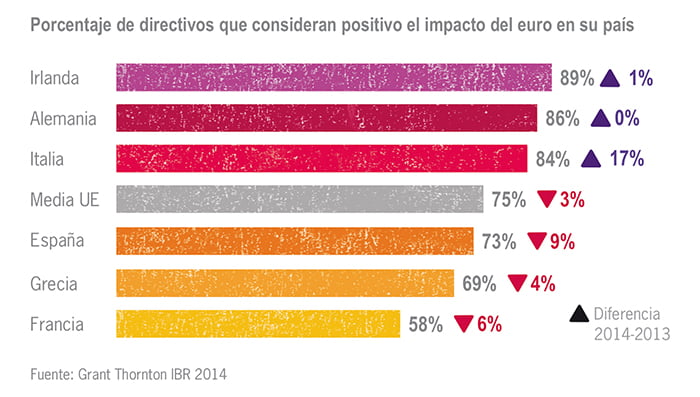 Quizá la prueba más clara del apoyo a Europa por parte de las empresas españolas es su percepción sobre las políticas de austeridad promovidas desde Bruselas. En Grecia e Irlanda, la opinión de que estas políticas han perjudicado el crecimiento de los negocios es mayoritaria (69% y 64% respectivamente). Sin embargo, en España ese porcentaje alcanza tan solo el 31%. De hecho, un 45% de los directivos afirma que las políticas de austeridad no han afectado al crecimiento de sus empresas, e incluso un 20% considera que dichas políticas han resultado positivas.