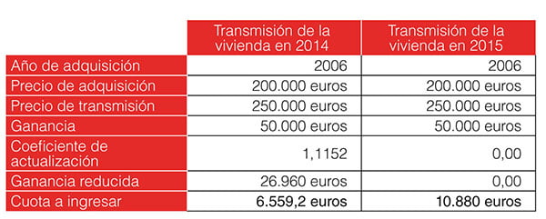 Sin embargo, si la venta se realizara durante el ejercicio 2015 por el mismo importe (250.000 euros), se generaría una ganancia general de 50.000 euros, a la cual le serían de aplicación los tipos impositivos de la base liquidable de ahorro establecidos para 2015, es decir, el 20% a los primeros 6.000 euros y el 22% al resto, generando una cuota a pagar de 10.880 euros. No siendo de aplicación para este caso los coeficientes de actualización. Ilustramos ambos escenarios en el Cuadro adjunto, donde se comprueba que la transmisión de la vivienda efectuada durante 2014 conlleva una tributación menor (ahorro fiscal de 4.320,80 euros) que si se realiza en el ejercicio 2015.