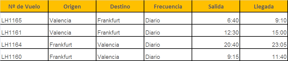 Con la llegada del horario de verano 2015, Lufthansa ampliará sus servicios desde y hacia Valencia con un segundo vuelo diario directo entre la capital levantina y la ciudad alemana de Frankfurt. Tan solo siete meses después de la reactivación de la ruta Valencia-Frankfurt, la aerolínea germana anuncia esta importante novedad que entrará en vigor el próximo 29 de marzo de 2015.