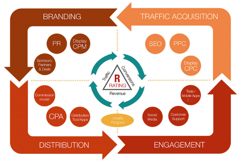 Toda estrategia digital global debe apoyarse en lo que yo llamo “los 4 Pilares de la eStrategy” y son: branding, traffic acquisition o adquisición de tráfico, smart engagement y distribution o distribución.