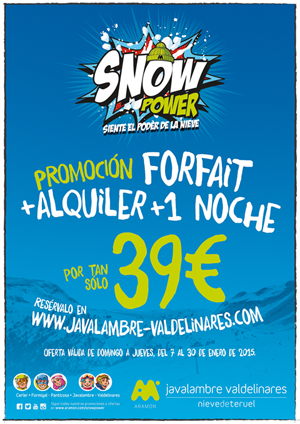 snowpowerteruelLas estaciones de esquí turolenses y la asociación turística de la comarca han lanzado conjuntamente una promoción que ofrece desde 39 euros por persona y día, alojamiento con desayuno, forfait y alquiler de material de esquí o snow. El objetivo de esta promoción es posicionar la comarca de Gúdar Javalambre como destino blanco asequible y con infraestructuras turísticas de gran calidad.