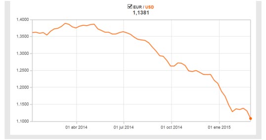 En un año, el euro se ha depreciado un 20% respecto al dólar. Si en marzo de 2014 cotizaba a 1,39 dólares, en la actualidad está 1,107.