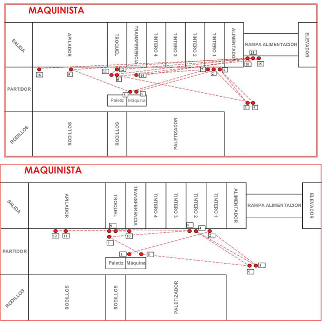 2. El Trabajo Estandarizado en los momentos de Cambios en las Máquinas (o limpiezas en la industria de la alimentación) seguirán las directrices emanadas al aplicar el Sistema Smed, una metodología contrastada y habitual en la aplicación de las herramientas Lean Manufacturing y que se basa en una estricta metodología para separar las actividades internas de las externas, así como balancear lo máximo posible el trabajo de los distintos operarios.Un ejemplo de ello se muestra en los gráficos reproducidos, donde se compara el método tradicional de un cambio en una Troqueladora Rotativa del cartón y el método Smed. El Estándar de Trabajo no consiste en aumentar la velocidad del operario sino en disminuir las tareas que no aportan valor (en este caso los movimientos).