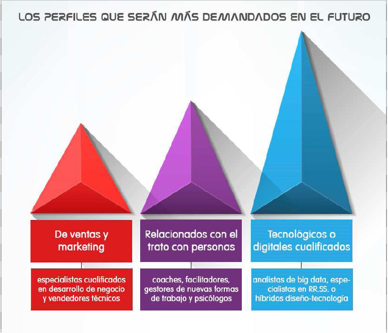 Estos sectores darán lugar a nuevos proyectos empresariales y a nuevas figuras profesionales que deberán cubrir las necesidades de cada mercado, con el consiguiente reto de adaptación y rápida evolución que requerirán cada uno de ellos. Serán los perfiles cualificados ligados a la tecnología y al ámbito digital, los perfiles vinculados al trato con personas y los especializados en marketing y ventas los que más relevancia alcanzarán en 5-10 años.