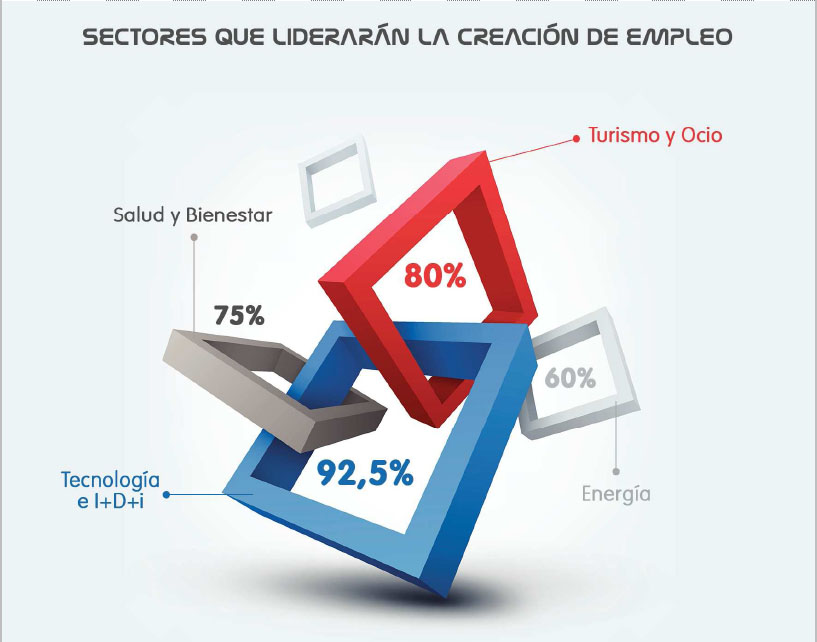 · El sector tecnológico y de I+D+i. Se considera el área que más empleo generará en los próximos 5 a 10 años, tal y como apunta el 92,5% de los expertos consultados. El desarrollo económico de España dependerá en gran parte de la capacidad del país de generar conocimientos científicos, tecnológicos e innovadores y de tener un liderazgo empresarial en I+D+i. Este gran reto estará ligado a la transformación digital, a la rentabilidad del sector y a la creación de startups.