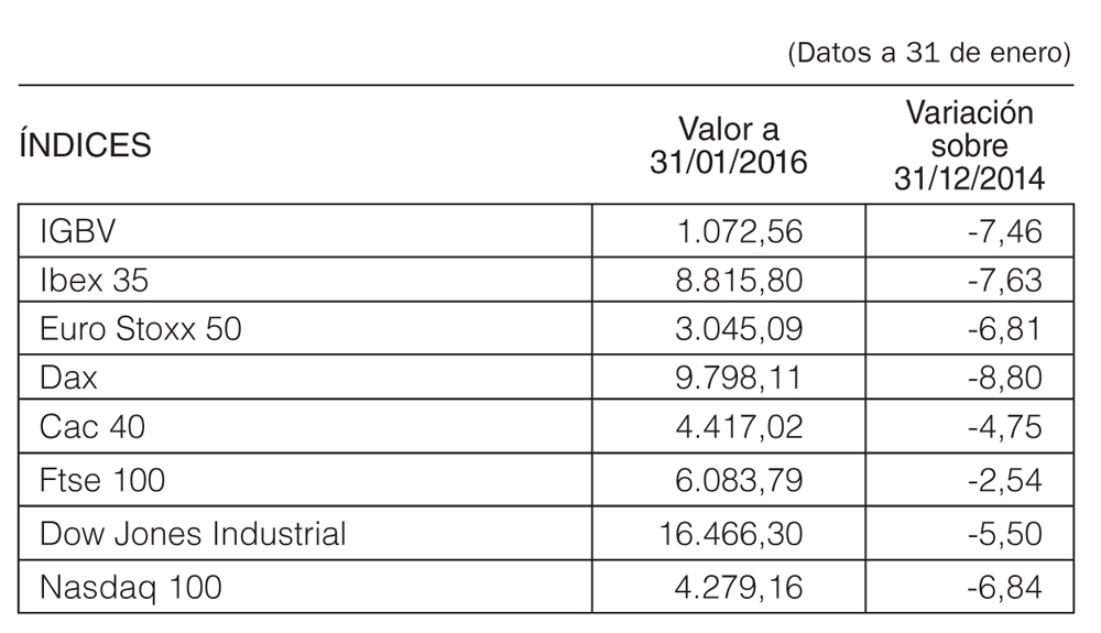 bolsavalenciaEn el mes de enero, el Ibex 35 ha bajado un 7,63 %, cerrando en los 8.815,80 puntos, mientras que el Índice General de la Bolsa de Valencia ha bajado un 7,46 % finalizando en los 1.072,56 puntos. En las principales plazas europeas también ha dominado el rojo. El Dax alemán ha bajado un 8,80 %, el CAC francés un 4,75 % y el FTSE 100 ha bajado un 2,54 %.