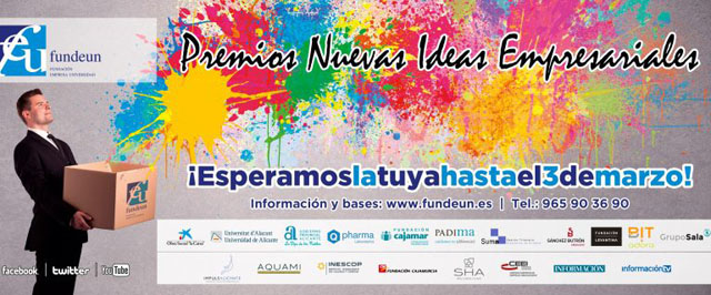 El 3 de marzo termina el plazo para presentar propuestas emprendedoras a los Premios Nuevas Ideas Empresariales de Fundeun. La XXIII convocatoria del certamen repartirá 25.400 euros entre los 11 proyectos ganadores. Para participar sólo es necesario cumplir los requisitos del certamen y presentar una idea escrita en dos folios en la sede de Fundeun en el plazo establecido. El certamen tiene como objetivo servir de estímulo para el desarrollo de actividades empresariales en la provincia de Alicante que apuesten por la innovación y la diversificación. Este año hay más premios con mayor dotación económica y ha aumentado también el número de empresas e instituciones implicadas, con dos nuevas categorías al mejor proyecto digital y al mejor proyecto vinculado a la movilidad.