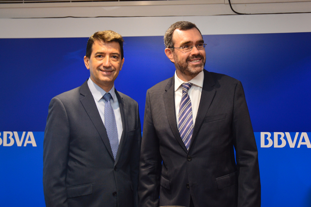 La nueva oficina de BBVA -que ocupa la antigua de Catalunya Bank- en la calle Barcas de Valencia fue esta mañana el escenario elegido para presentar el informe de Situación Comunitat Valenciana, por parte del jefe de Análisis Macroeconómico de BBVA Research, Rafael Doménech, junto a Alberto Charro, director territorial de la entidad bancaria. El informe no puede ser más optimista respecto a la evolución económica de la Comunidad Valenciana, para la que se augura un crecimiento del 2,7% en 2017 y del 2,6% para el próximo año.