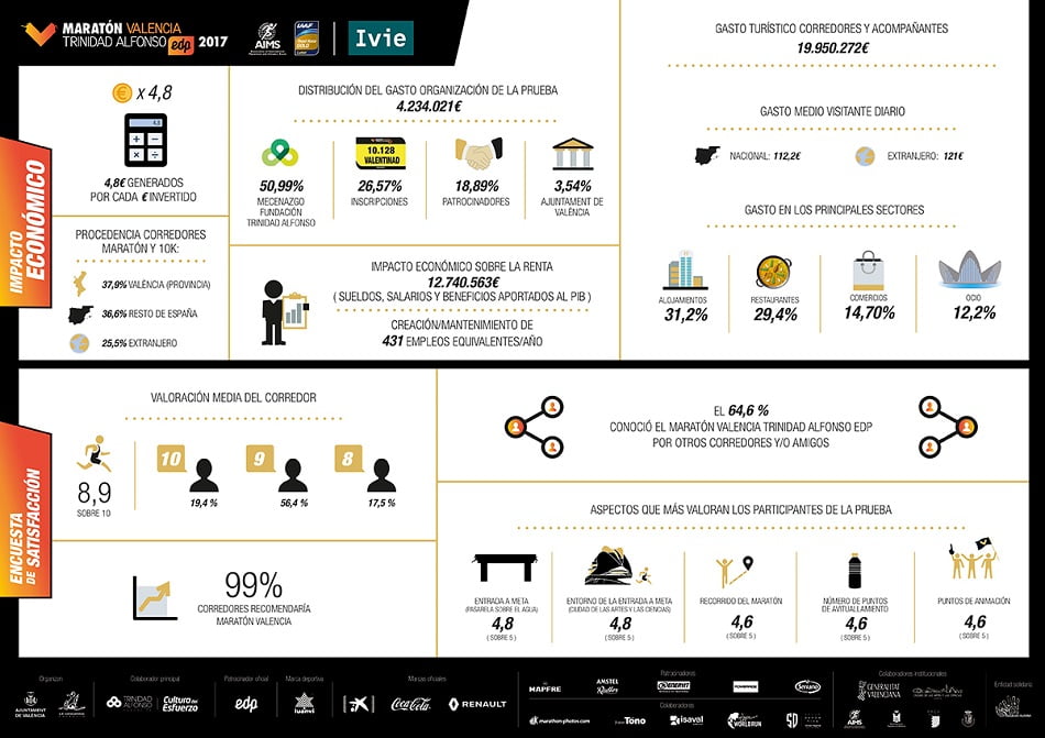 El Maratón Valencia Trinidad Alfonso EDP presenta los resultados del estudio de impacto económico que ha realizado el Instituto Valenciano de Investigaciones Económicas (IVIE) sobre la última edición y que depara interesantes y positivas cifras. El gasto de la organización, a cargo de SD Correcaminos y el ayuntamiento de Valencia, asciende a 4.234.021€ y cada uno de los euros invertidos en el evento se ha traducido en 4,8 euros generados de gasto turístico, casi 20 millones de euros. Esta elevada cifra refleja la relevancia del evento a nivel nacional e internacional y el beneficio para la ciudad, ya que menos del 4% del gasto sale de dinero público.