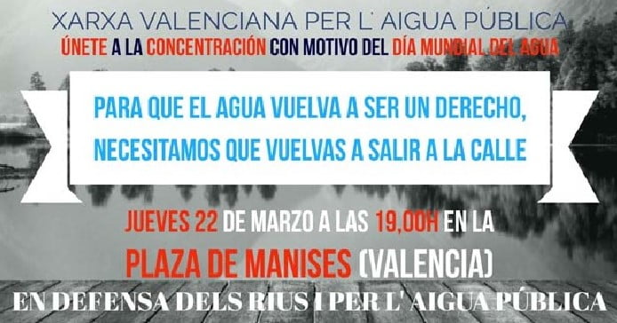 Como organización integrante de la Xarxa Valenciana per l’Aigua Pública, CCOO-PV participará en la concentración «En defensa dels Rius i per l’aigua pública«, convocada hoy a las 19h en la Plaza Manises. La reivindicación se enmarca en la celebración del Día Mundial del Agua y reclamará políticas efectivas de protección de los ríos y otros ecosistemas acuáticos, el fin de los procesos de privatización y la recuperación de la gestión pública del agua.
