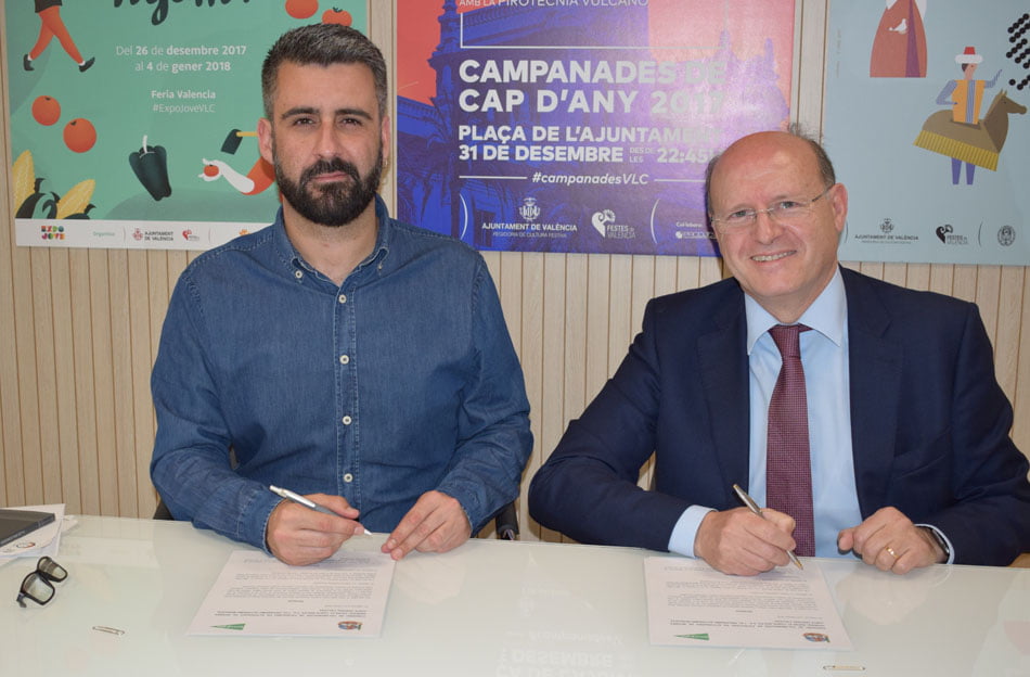 El concejal de Cultura Festiva, Pere Fuset, y el director regional de El Corte Inglés, Juan Sabater, han renovado hoy el patrocinio de la compañía de grandes almacenes a Junta Central Fallera para el ejercicio 2019 en un acto que ha tenido lugar esta mañana en el Ayuntamiento de Valencia.