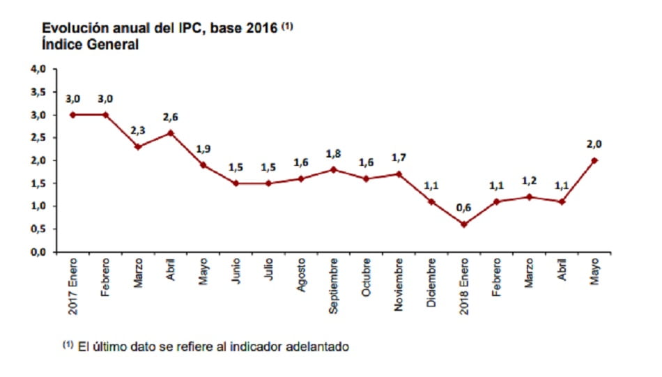 Esta subida del mes de mayo es la vigésima primera tasa positiva que encadena el IPC, hasta alcanzar un nivel que no se daba desde abril de 2017, cuando se situó en el 2,6%.