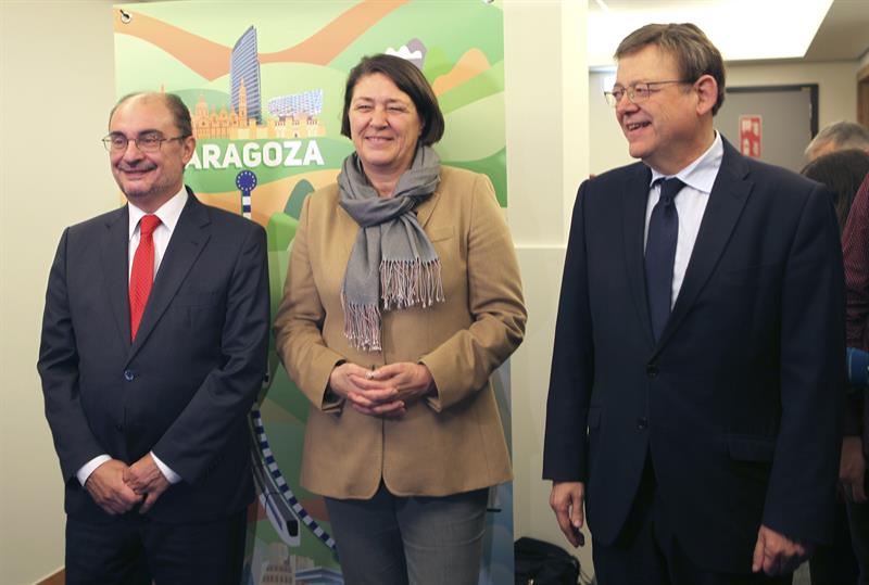 La comisaria europea de Transportes Violeta Bulc (c), el presidente de la Generalitat Valenciana Ximo Puig (d) y el presidente de Aragón Javier Lambán (i). EFE | Yuval Molina Obedman