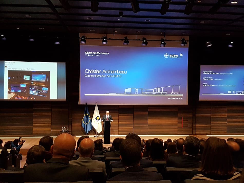 La Oficina de la Propiedad Intelectual de la Unión Europea (EUIPO) prevé llegar este año a la cifra de 2 millones de solicitudes de marca cuando se cumplen 25 años de su puesta en funcionamiento en la ciudad de Alicante. Así lo puso de manifiesto ayer su nuevo director ejecutivo, el belga Christian Archambeau, durante el acto de bienvenida al Año Nuevo al que acudieron en torno a 400 personas entre autoridades y representantes de los principales estamentos sociales, económicos, y empresariales de la provincia, entre ellos, el presidente de la Generalitat, Ximo Puig, y los alcaldes de Alicante y Elche, Luis Barcala y Carlos González.