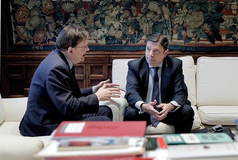 El president Puig y el ministro Planas conversan antes de reunirse con los representantes de sector agrícola. | EFE / Manuel Bruque