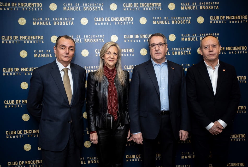 Salvador Navarro, presidente de la CEV; Amparo Maties, presidenta del Club de Encuentro Manuel Broseta; Arturo León, secretario general de CC.OO.-PV; e Ismael Sáez, secretario general de UGT-PV. |