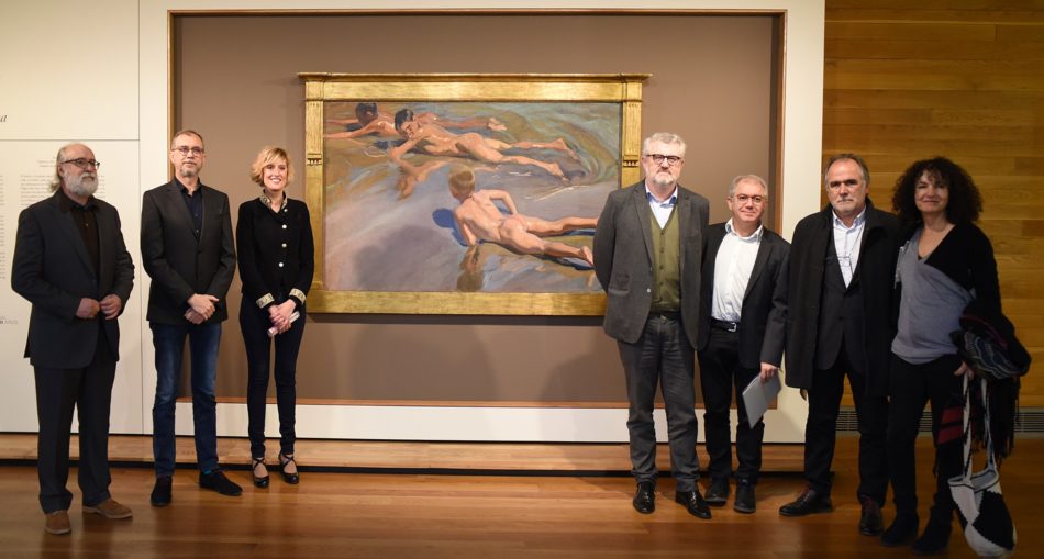 El óleo sobre lienzo del valenciano Sorolla fue realizada en 1909 y muestra a unos niños juegan en la playa del Cabañal de València y denota el interés del autor por resolver, con una ejecución inmediata, la compleja dificultad que planteaban los brillos cambiantes, los reflejos y las sombras en el agua de los desnudos, según apuntan ambos directores.