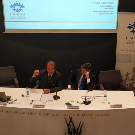 Emilio Ontiveros (i), presidente de Afi, en la jornada sobre las tendencias del entorno económico para la empresa familiar organizada ayer en la CEV.