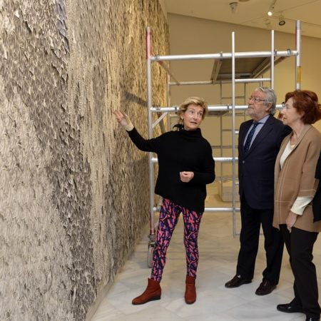 Soledad Sevilla, el presidente de la Fundación Bancaja, Rafael Alcón, y las comisarias de la próxima exposición durante el montaje de la instalación. | E3