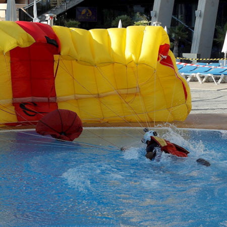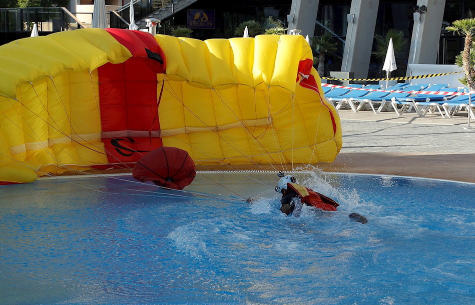 Los paracaidistas han realizado los saltos de las semifinales entre los que se han puntuado el tiempo de apertura del paracaídas, el grado de apertura y la precisión en la diana de aterrizaje, situada al lado de las piscinas del Gran Hotel Bali.