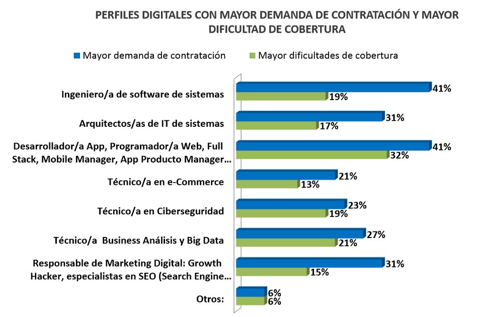 Este desajuste estructural entre necesidades de formación y cualificación que requieren las empresas y la oferta de formación y cualificaciones que provee el sistema educativo, se ve reflejado en la coexistencia entre niveles elevados de paro y a la vez de puestos no cubiertos. De hecho, las empresas alertan del déficit de oferta formativa en puestos como Ingeniero de software de sistemas, desarrolladores de APP y programador web, técnicos/as de e-commerce, Arquitectos/as de IT de sistemas, Técnico/a Business Análisis y Big Data y temen que la dificultad para cubrirlos aumente en los próximos años ante el déficit de la oferta formativa.