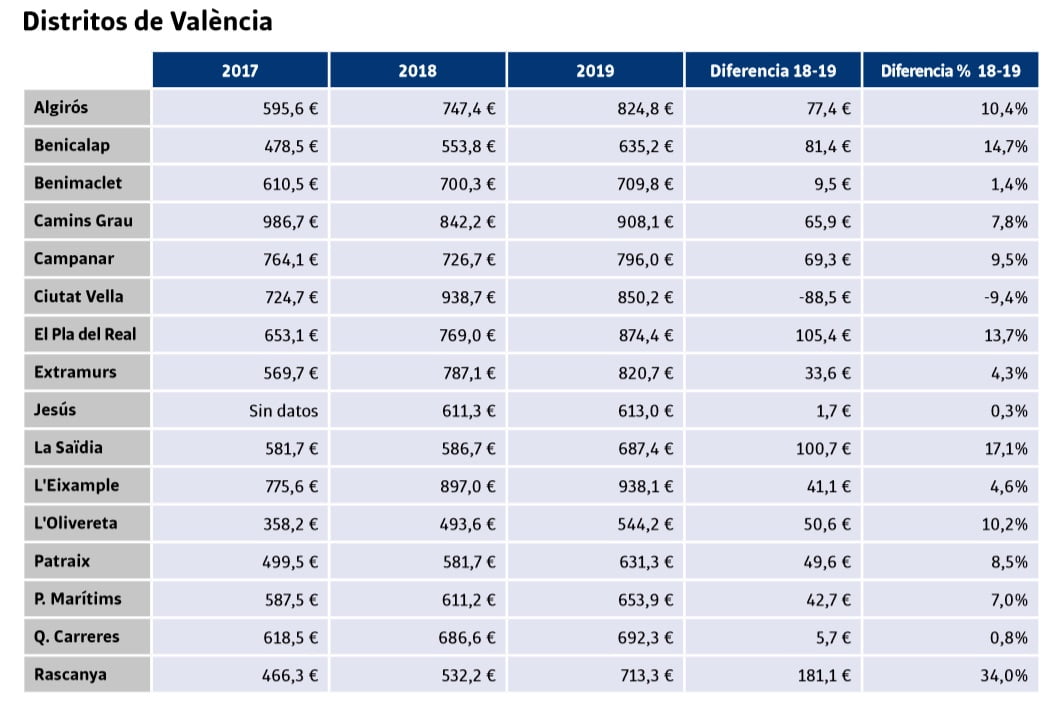 A pesar de este enfriamiento, la zona norte presenta los mayores incrementos en los precios siendo los pisos de Rascanya los que se han encarecido con una media de 181,10 euros en tan solo un año. Un cifra relevante teniendo en cuenta que en 2017 una vivienda arrendada costaba alrededor de 466,30 euros y en el último cuatrimestre de 2019, 713, 30 euros.
