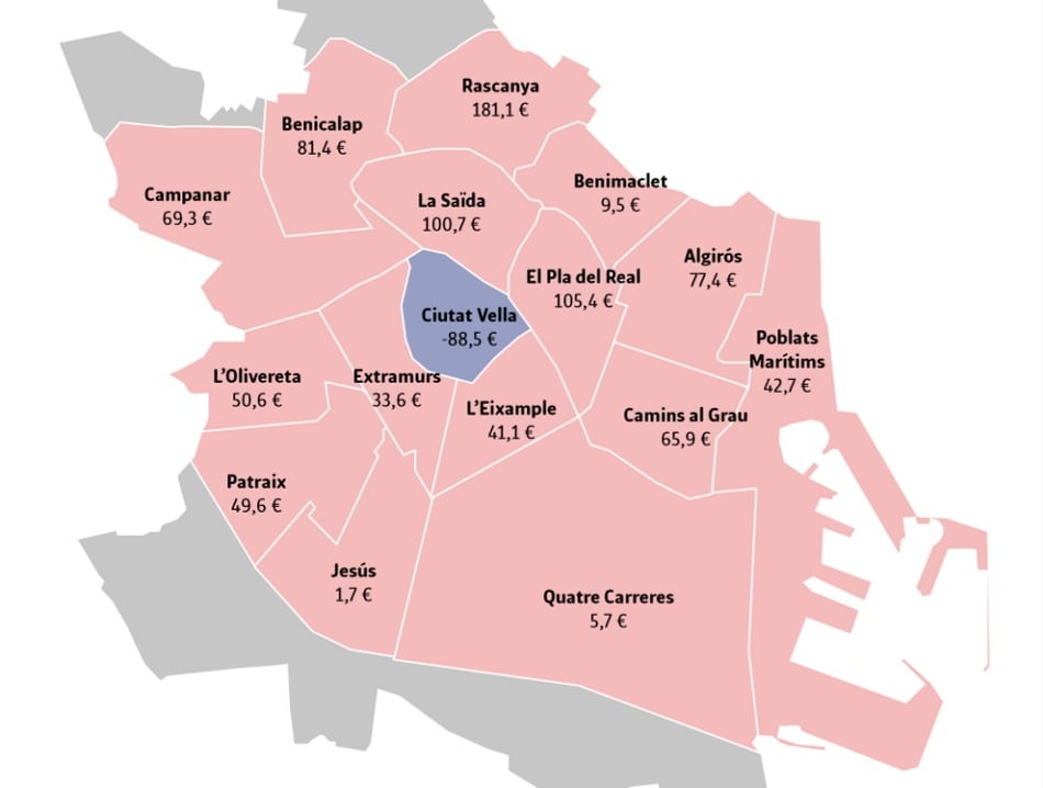 Esto significa que alquilar en barrios como Torrefiel u Orriols cuesta 247 euros más al mes que hace dos años. Otros sectores que presentan subidas destacables son el de El Pla del Real, con 105,40 euros de media y La Saïdia con 100,70 euros.