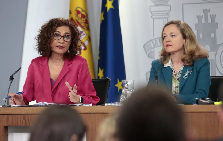 La ministra de Hacienda y portavoz del Gobierno, María Jesús Montero, durante su intervención posterior al Consejo de Ministros, acompañada de la vicepresidenta tercera y ministra de Asuntos Económicos y Transformación Digital, Nadia Calviño.