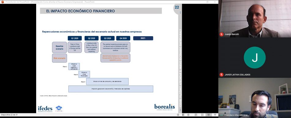 Bajo el título ¿cómo afrontar el nuevo escenario empresarial?, Juan José Barceló, Consultor Desarrollo de Negocio en Grupo Ifedes y miembro asesor independiente en Consejos de Administración y Comités de Dirección; y Francisco Alba, Consultor de Operaciones Corporativas de la división de Corporate Finance & Ventures de Grupo Ifedes, Borealis han explicado que las empresas deben asumir que ha llegado un momento de cambio de ciclo, en el que dejarse llevar por la desorientación y el miedo irracional no contribuye a salir reforzados.