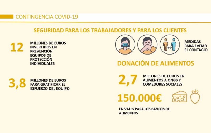 Para garantizar la salud de los trabajadores, Consum ha empleado hasta ahora 12 millones de euros y prevé que la factura anti COVID suba otros 20 millones. La coopearativa fue pionera en medidas como poner un teléfono gratuito de apoyo psicológico para el personal, dar una gratificación por un montante de 3,8 millones de euros o, la última medida aplicada, implantar un sistema digital de control de aforo.