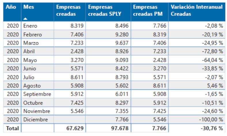 En el acumulado del año (enero-noviembre) las cifras no mejoran, en el ámbito nacional se mantiene esa cuarta parte menos de compañías creadas que en 2019 (67.629 en lo que llevamos de 2020 frente a las 89.912 de 2019); mientras que, la Comunitat suma 8.024 compañías frente a las 10.664 de 2019, es decir la misma caída porcentual que a nivel nacional, prácticamente un 25% menos.