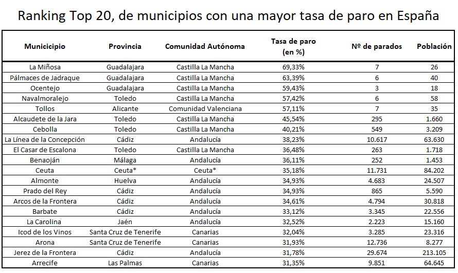 La comunidad más meridional de la Península aglutina hasta ocho localidades dentro del Top 20. Dentro de estas, más de la mitad pertenecen a la provincia de Cádiz: La Línea de la Concepción (38,23 %), Prado del Rey (34,93 %), Arcos de la Frontera (34,61 %), Barbate (33,12 %) y, finalmente, Jerez de la Frontera (31,78 %). Completan los municipios andaluces la localidad malagueña de Benaoján (36,11 %), la onubense de Almonte (34,93 %) y la jienense de La Carolina, con una tasa de paro del 32,52 %.