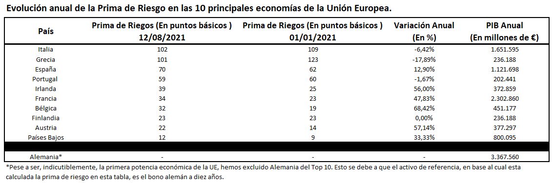 Cuando hablamos de prima de riesgo, normalmente nos referimos a países. Concretamente, al plus que tiene que pagar por endeudarse frente a otros a los que se les intuye una mayor solvencia. En este caso, y al igual que en la inmensa mayoría de ocasiones el activo de referencia va a ser el bono alemán a diez años. Es decir, cuánto pagan de prima (más que Alemania) estas naciones por obtener financiación a diez años.