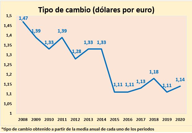 El periodo 2008-2020 concluye con una depreciación del 22,45% del euro frente al dólar