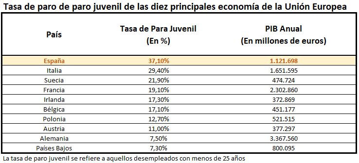 Si el paro es uno de los problemas endémicos de nuestra economía, este es especialmente incisivo con su juventud. La tasa de paro de los jóvenes españoles (considerando a estos a aquellos de menos de 25 años) actual se sitúa, con datos del mes de junio, en el 37,1%. Cotas impropias y de difícil conciliación con aquello que se entiende debería registrar la economía de un país desarrollado.
