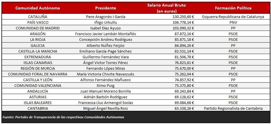 El presidente de la Generalitat de Catalunya, Pere Aragonès, con un salario bruto anual de 130.250,60€, es el presidente autonómico mejor pagado. Le sigue, a una distancia considerable, Iñigo Urkullu. El lehendakari percibe, por sus labores al frente del Gobierno vasco, un salario bruto anual de 106.778,14€.