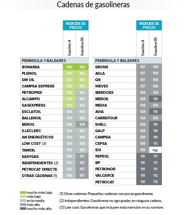- BonÀrea es la cadena más barata en gasóleo A y gasolina 95. Se trata de una cadena de supermercados y estaciones de servicio en Cataluña y zonas limítrofes de Aragón.