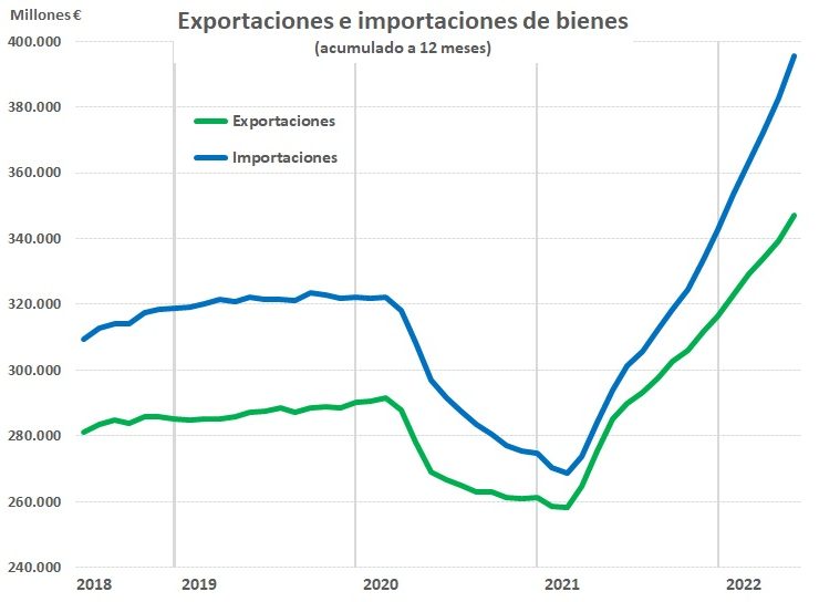 Los datos de mayo muestran cifras récord tanto en exportaciones, que han aumentado un 24,4%, como en importaciones, 40,7%; tal y como recoge el informe de comercio exterior publicado por el Ministerio de Industria, Comercio y Turismo. Pese a ello, el aumento no ha sido suficiente para contrarrestar el fuerte incremento de los precios del combustible.