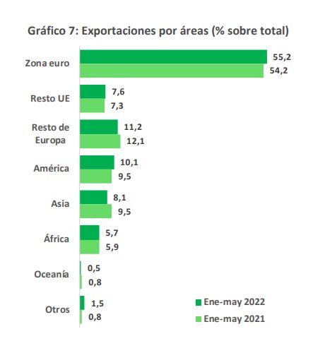 Las exportaciones dirigidas a la Unión Europea (UE) avanzaron un 27,1 % anual y las destinadas a la zona euro el 26,7 %. De entre los principales países socios, los mayores aumentos correspondieron a las exportaciones a Portugal (39,3 %), Italia (2 %), Francia (19,5 %) y Alemania (12,5 %).