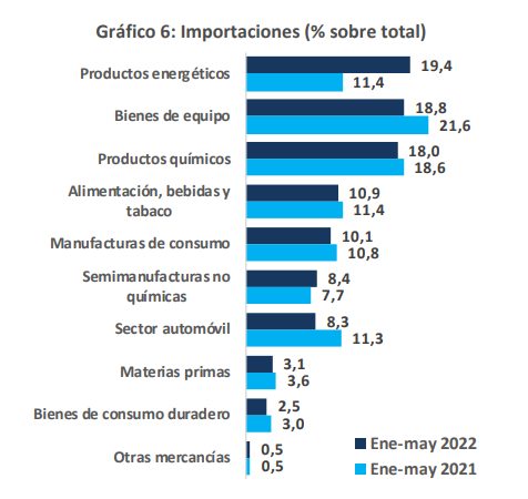 Pese a la subida histórica de las exportaciones, los datos negativos del déficit comercial se explican por el aumento de la demanda de productos energéticos, que alcanzó el 69,6%. A esto hay que sumar la importante subida de precios, del 41,3%, que explica los datos negativos. Aunque menor, en las importaciones de productos no energéticos también hubo un incremento de precios del 15,2 %.