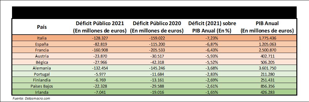 El país transalpino, con un déficit del 7,23% sobre su PIB nominal, fue el que presentó un mayor desequilibrio entre sus gastos e ingresos. Muy de cerca, con un desajuste presupuestario del 6,87% en 2021, se sitúa España.
