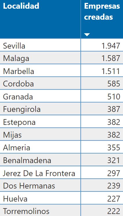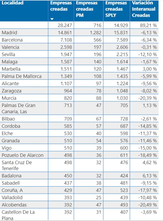 El top ten lo completan por este orden: Sevilla, Málaga, Marbella, Palma de Mallorca, Alicante, Zaragoza y Murcia. En la siguiente tabla se pueden consultar el resto de localidades con más creación: