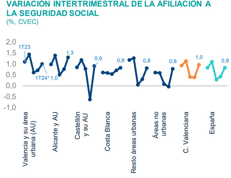 El ritmo de crecimiento de la afiliación a la Seguridad Social está siendo especialmente significativo en la Comunitat Valenciana. Con datos desentacionalizados, está creciendo al 1% trimestral, esto elevado a tasa anual, sería un 4%, frente al 3,6% de España.