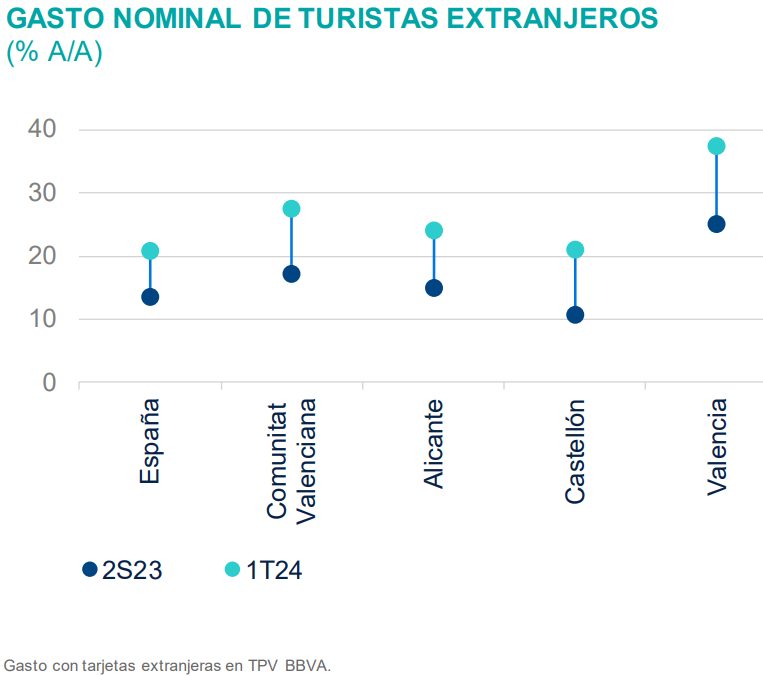 Pero si el turismo nacional crece en España, el dinamismo del turismo extranjero es todavía mayor. El gasto con tarjetas extranjeras en TPV de BBVA aumentó un 27,5% con respecto al año pasado en el primer trimeste, un 20,9% si tenemos en cuenta el conjunto de España. En el caso de Valencia está por encima del 35%.