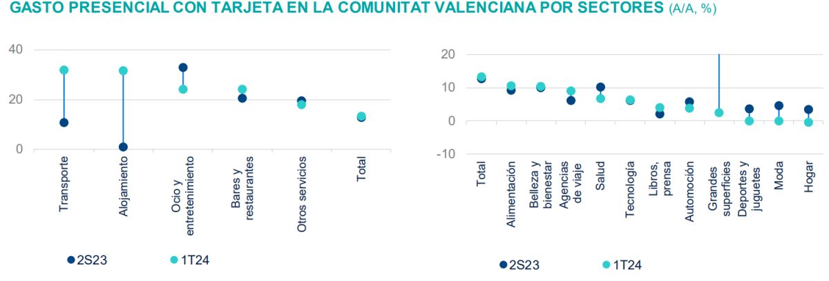 Si le tomamos el pulso al gasto en tiempo real que se registra en la C. Valenciana en compras con tarjeta, mejora en transporte, alojamiento y restauración, con tasas de crecimientos interanuales superiores al 15%, «obviamente una parte, se corresponde con el incremento de los precios, pero este es muy inferior y no explica todo el dinamismo», subraya Doménech.
