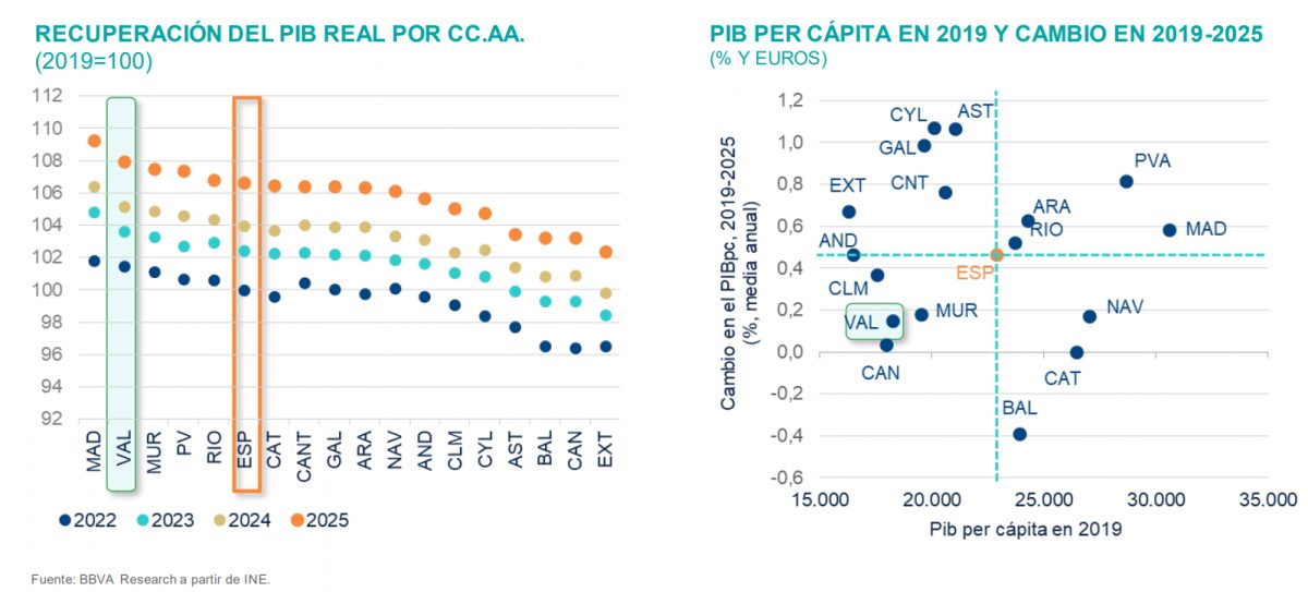 De hecho tras Madrid, la C. Valenciana es la región que mejor ha recuperado su PIB desde el año 2019, hablamos de la segunda recuperación más intensa, dado que la región valenciana se sitúa ya cinco puntos por encima del nivel prepandemia.
